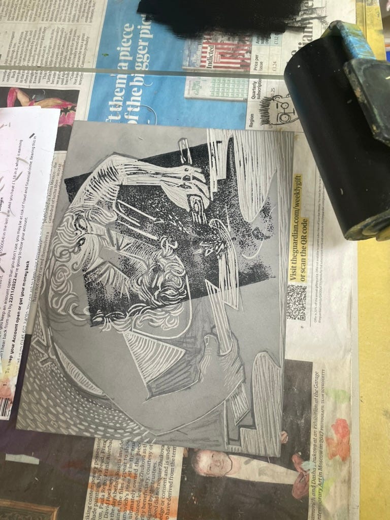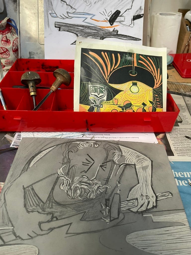 Work in progress, Vulcan linocut by Sheena Mary Davies for Cradle of Fire