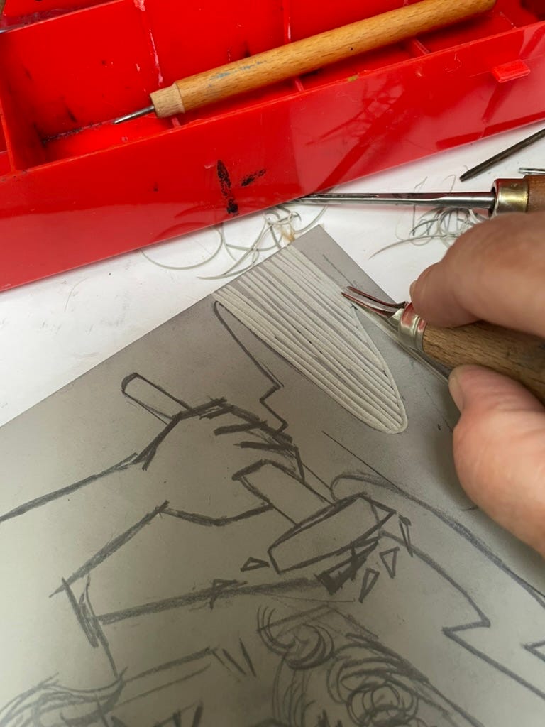 I decided to transfer a drawing to lino for an artisan feeling as a nod to the hand forged work of the blacksmith, manually crafted using a traditional method.