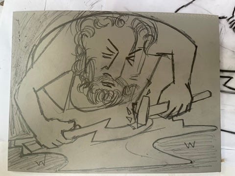 My first sketches were rough and ready, made with a scratchy dip pen and minimal planning! I just went headlong into depicting Vulcan as I had envisaged him, in his forge, hammering out another thunderbolt for the gods.